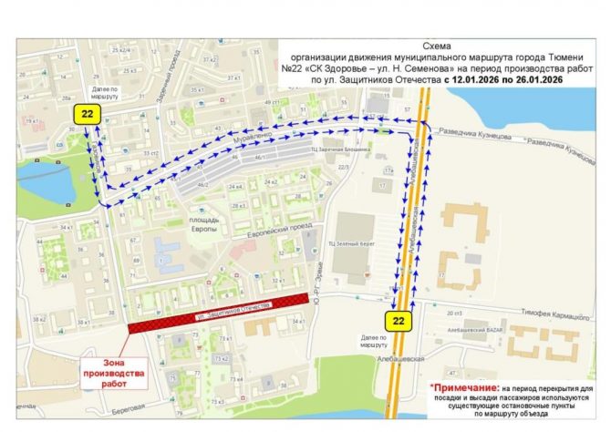 В Тюмени временно изменится схема движения автобуса №22. Ограничения будут действовать с 12 по 26 января и связаны с проведением работ на улице Защитников Отечества в районе перекрёстка с улицей Газовиков.