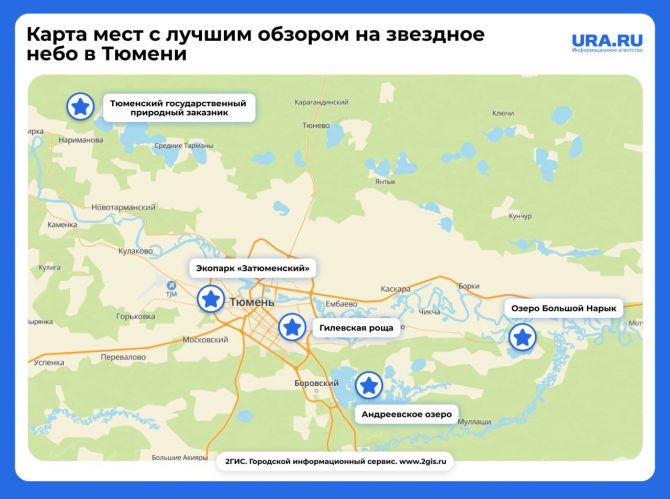 Тюменцы, желающие полюбоваться звёздным небом, могут отправиться в несколько локаций с минимальной световой загрязнённостью. Ближе всего к городу — экопарк «Затюменский» и Гилевская роща, где после полуночи отключают освещение. На Андреевском озере (5 км от Тюмени) самый тёмный участок — правый берег. За 25 км у озера Большой Нарык (со стороны д. Криводаново) открываются особенно чёткие виды. Для максимальной темноты подойдёт Тюменский заказник в Нижнетавдинском районе (50 км): здесь отсутствуют источники света, что идеально для наблюдения за Млечным Путём и метеорами. Астрономы советуют выезжать после 00:00 в безлунные ночи.