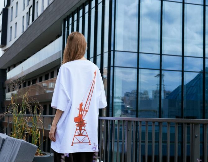 Символ жилого района «Речной порт» — легендарный портальный кран «Ганц» — теперь можно носить на себе. Девелоперская компания «Брусника» совместно с уральским брендом TABOO выпустили лимитированную коллекцию одежды с изображением крана.