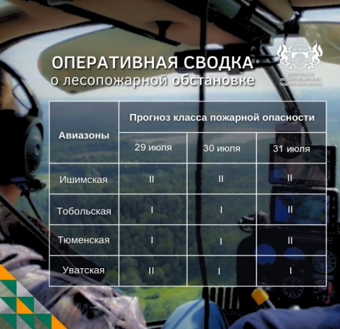В Тобольской и Тюменской авиазонах установлен I класс пожарной опасности — риска возгораний нет. В Ишимской и Уватской — II класс, что означает низкую степень опасности.