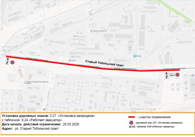 С 20 марта 2026 года на участке улицы Старый Тобольский тракт введут ограничения по остановке и стоянке автомобилей. Речь идёт о отрезке от железнодорожного переезда в районе здания № 2, стр. 11 (5-й километр) до здания № 11 (7-й километр).