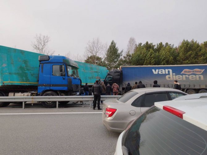 На автодороге Тюмень — Тобольск, в направлении Ханты-Мансийского автономного округа, произошло ДТП с участием нескольких большегрузных автомобилей. По предварительным данным, жертв нет. Движение на трассе затруднено, поскольку один из грузовиков перегородил проезжую часть.