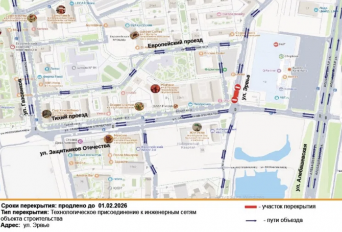 Перекрытие действует в районе пересечения с улицей Защитников Отечества.