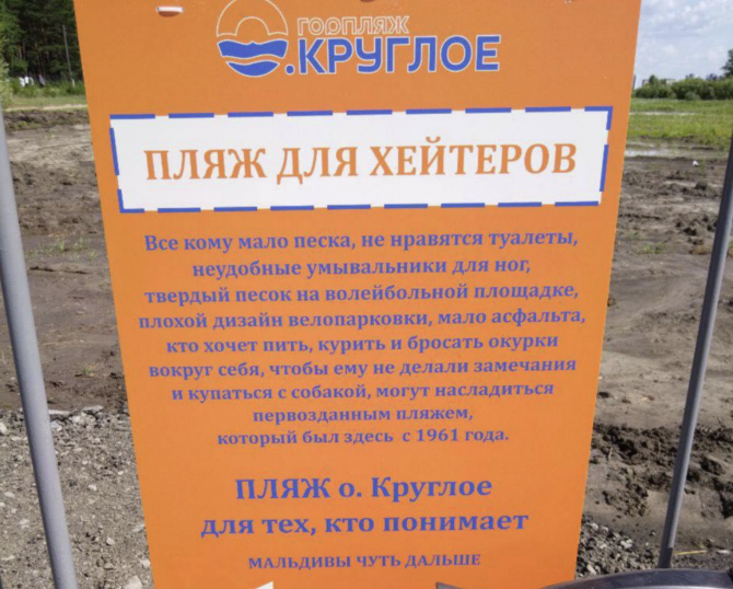 На обновлённом городском пляже озера Круглое появилась провокационная вывеска, ставшая местной достопримечательностью. Чёрно-белая табличка с заголовком «Пляж для хейтеров» иронично перечисляет «претензии»:
