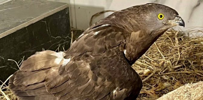 Ветеринары установили, что у осоеда был перелом крыла, который сросся неправильно. Сейчас птицу лечат и восстанавливают под наблюдением специалистов.
