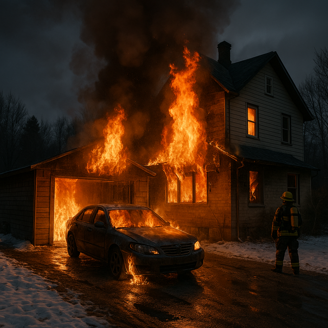 В деревне Решетникова Тюменского округа в полночь вспыхнул автомобиль «Ниссан». Огонь быстро распространился, повредив гараж и двухэтажный жилой дом. Общая площадь возгорания составила 58 квадратных метров.