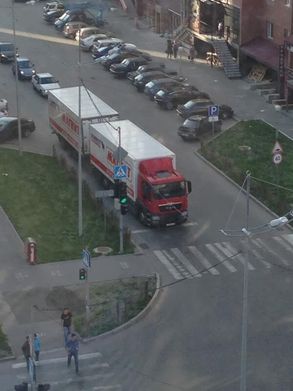 2. Грузовик, движение которых по улицам города ограничено, в центре. Еще и поворачивает под запрещающий знак.