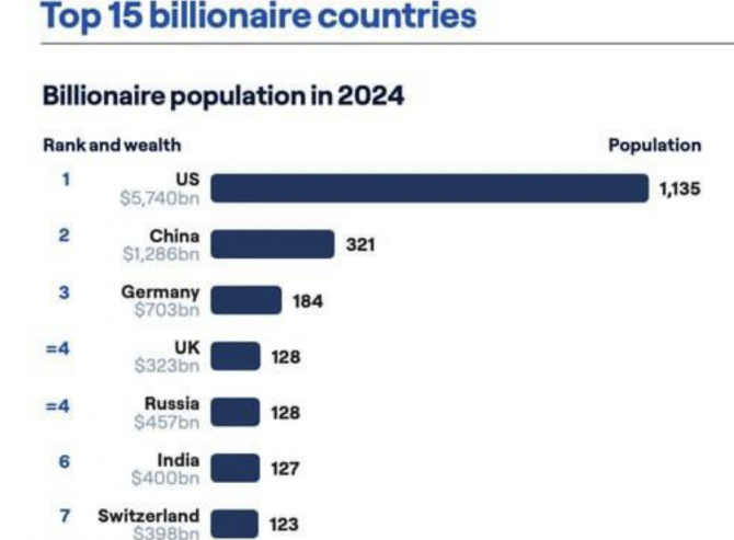 По информации исследования, в России насчитывается 128 миллиардеров. Самым богатым россиянином назван акционер компании «ЛУКОЙЛ» Вагит Алекперов — его состояние оценивается в 28,7 миллиарда долларов.