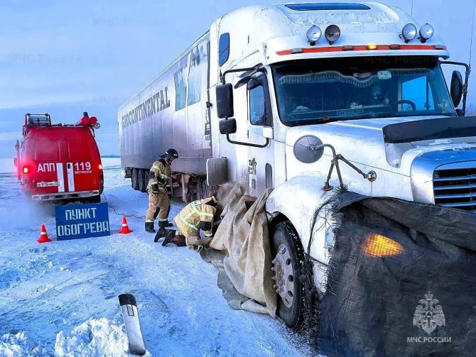 Днём на 159-м километре трассы одновременно два большегруза — КАМАЗ и SITRAK — столкнулись с замерзанием топливной системы. Сотрудники МЧС применили тепловую пушку и помогли отогреть оба автомобиля.