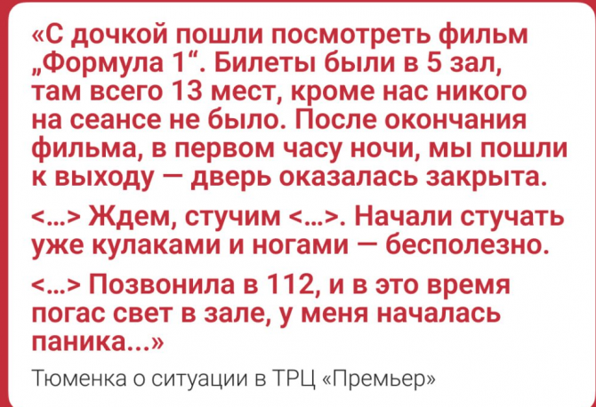 8 августа в тюменском кинотеатре ТРЦ «Премьер» произошел тревожный инцидент. Женщина с дочерью-подростком, посмотрев фильм, обнаружили себя запертыми в кинозале — основной и запасной выходы оказались закрыты, а охранника рядом не было. Ситуация усугубилась, когда после окончания титров в зале погас свет, вызвав панику у посетительниц.