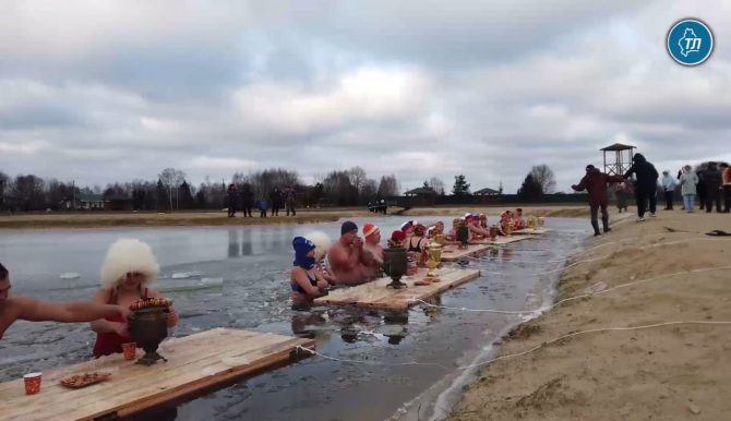 Для участников организовали импровизированные «столы» — плотики у берега, разожгли антикварные самовары и разложили баранки. Несмотря на мороз, вода моментально покрывалась льдом, но моржам хватило 15 минут, чтобы провести настоящий чайный обряд.