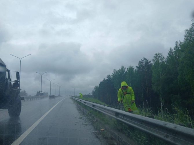 Тюменские рабочие косят траву под дождем на Объездной дороге