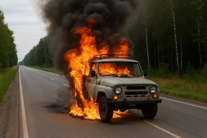 Вчера около 17:00 на 5-м километре автодороги Кротово–Сорокино загорелся автомобиль УАЗ. Огонь вспыхнул во время движения — водитель успел остановиться и вызвать пожарных.