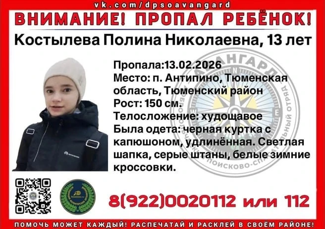 В посёлке Антипино Тюменского района разыскивают 13-летнюю Полину Николаевну Костылеву. Девочка пропала 13 февраля 2026 года. По информации близких, она может находиться в любом районе города и области.