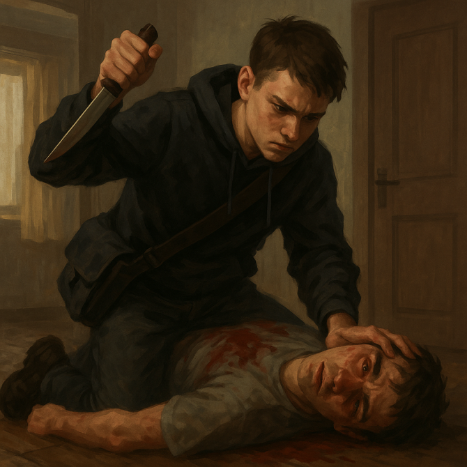 В июле 2024 года парень решил, что его друг может оговорить его в деле об угоне ВАЗ-2105. Чтобы запугать, он пришёл к нему домой с ножом, ударил по лицу, а затем стал хаотично наносить удары по телу. Спасти пострадавшего удалось благодаря соседям.