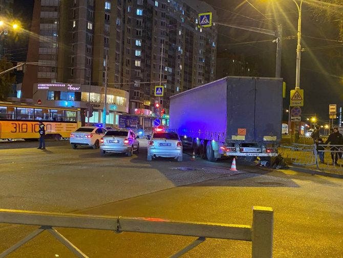 Вечером 1 октября в Екатеринбурге на улице Советской, 24А произошло трагическое ДТП. 51-летний водитель фуры Freightliner из Тюмени, поворачивая направо на зелёный сигнал, задел бордюр, на котором стояла женщина.