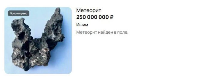 Необычное объявление появилось в сети: житель Ишима решил продать фрагмент метеорита и оценил находку в четверть миллиарда рублей. По словам автора, редкий объект он обнаружил в поле, а состояние лота описывает как «новое» — будто камень только что упал с неба.