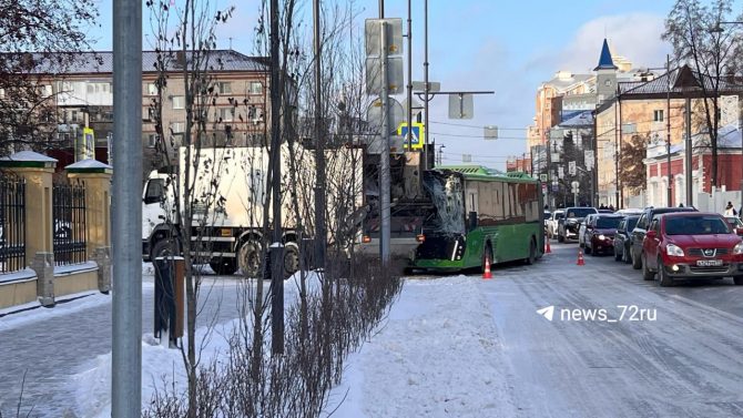 На улице Ленина, у центра «Пионер», сегодня днём произошло ДТП с участием автобуса и мусоровоза. По словам очевидцев, общественный транспорт врезался в спецтехнику — удар пришёлся в переднюю часть. Лобовое стекло автобуса разбито практически полностью.