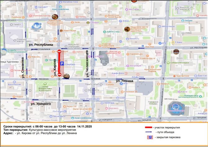 14 ноября в центре Тюмени временно ограничат движение транспорта.