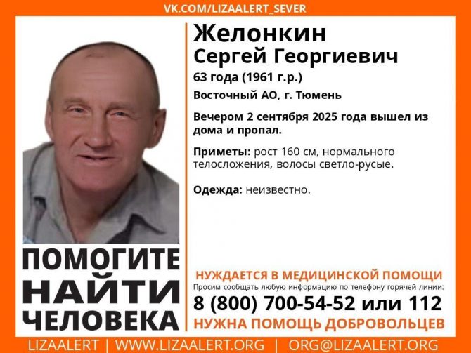 Восточный район Тюмени поднят на поиски: 63-летний Сергей Желонкин вечером 2 сентября ушёл из дома и пропал. Родные обратились за помощью к волонтёрам только сегодня.