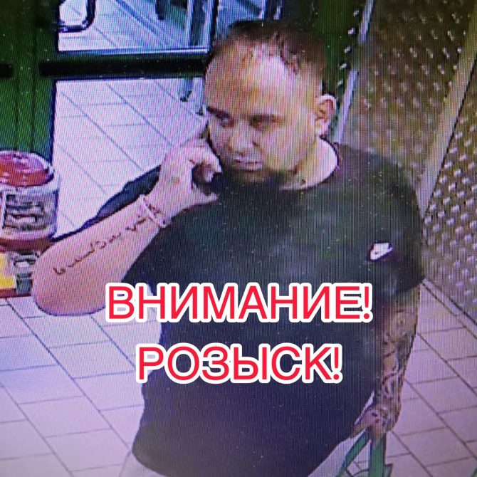 Подозреваемому на вид 35–40 лет, среднего роста, плотного телосложения. Был в светлых шортах до колен, белой футболке и кроссовках, при себе — зелёная сумка. Особая примета — татуировка на левой руке от плеча до кисти.
