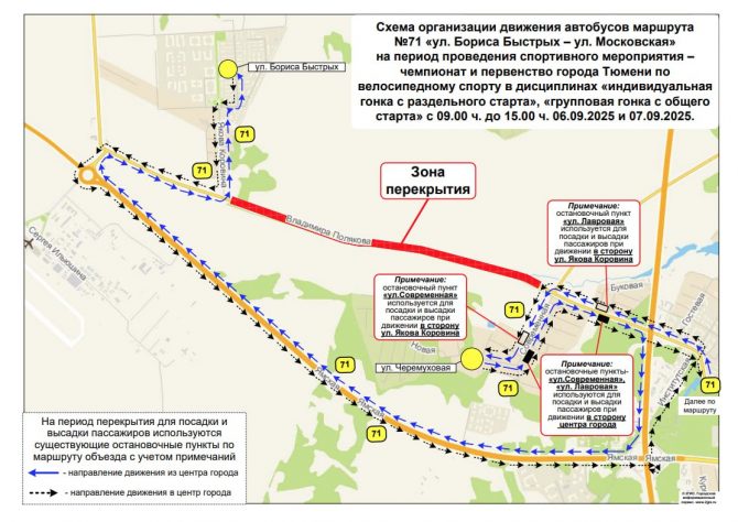 6 и 7 сентября в Тюмени пройдут чемпионат и первенство города по велоспорту. Из-за соревнований с 9:00 до 15:00 будет перекрыт участок улицы Владимира Полякова — от Современной до Якова Коровина.