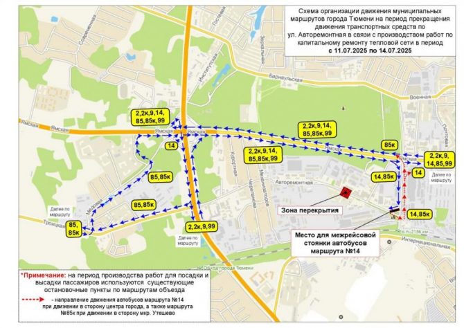 С 11 по 14 июля в Тюмени перекроют участок ул. Авторемонтной — общественный транспорт пойдёт в объезд, предупреждает мэрия.