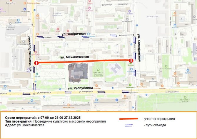 27 декабря с 07:00 до 21:00 движение по улице Механической (участок от ул. Холодильной до ул. Максима Горького) будет закрыто. Ограничение связано с проведением праздничного мероприятия «Открытие главной ёлки» на площади 400-летия.