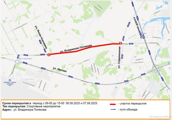 6 и 7 сентября с 9:00 до 15:00 движение по улице Владимира Полякова будет закрыто на участке от улицы Современной до улицы Якова Коровина.