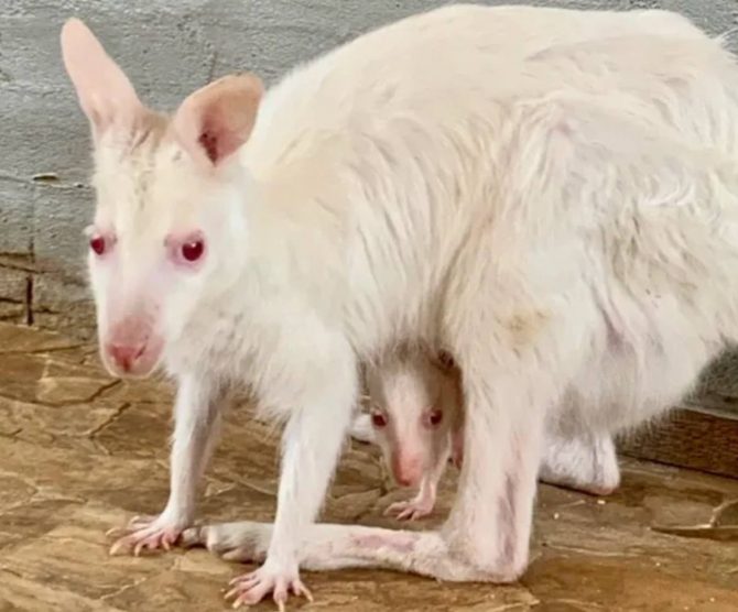 В тюменском центре «У Лукоморья» живут сразу два белоснежных кенгуру — мама Бетти и её новорождённый детёныш. Бетти появилась на свет здесь же два года назад, а теперь сама стала мамой.