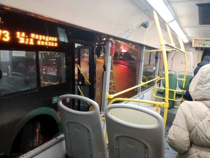 В результате удара в 17-м автобусе выбило стёкла. Пострадавших, по предварительным данным, нет.