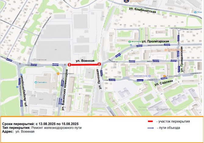 В Тюмени с 13 по 15 августа будет закрыт для проезда участок улицы Военной между улицами Почтовая и Бакинских Комиссаров. Ограничение движения связано с проведением ремонтных работ на железнодорожном переезде. Автомобилистам рекомендуется планировать маршрут заранее и воспользоваться объездными путями по улицам Пролетарская, Садовая, Бакинских Комиссаров и Почтовая.