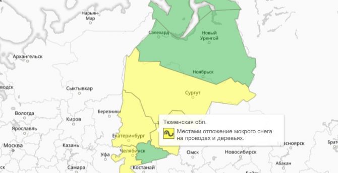 В ближайшие сутки в Тюменской области прогнозируются неблагоприятные погодные явления: сильный ветер с порывами до 16 м/с, дождь и мокрый снег. Регион попал в «желтую» зону предупреждений.