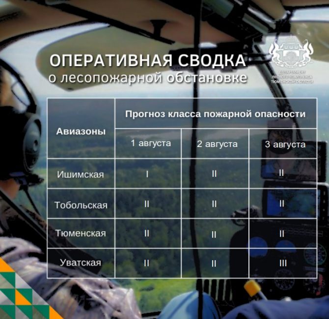 На сегодняшний день в Ишимской авиазоне установлен I класс пожарной опасности — то есть, угрозы нет. В Тобольской, Тюменской и Уватской — II класс (низкий риск). Прогноз на ближайшие дни обещает умеренную обстановку, однако в Уватском районе 3 августа ожидается III класс — средняя степень опасности.