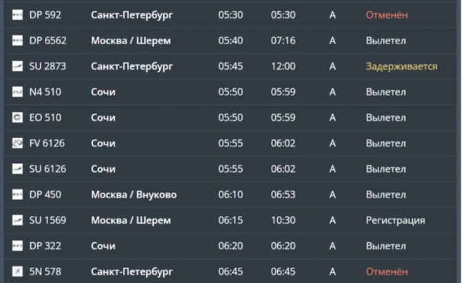 Также задерживаются другие вылеты: SU 2873 перенесли с 05:45 на полдень, а два рейса, намеченные на 10:10, сдвинулись на 22:00. Причины сбоев пока не уточняются.