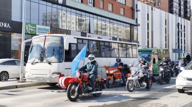 После этого колонна с флагами проехала по городу и направилась к бульвару Пожарных и спасателей. Во главе шествия ехал легендарный пожарный мотоцикл, оснащённый всем необходимым для работы в труднодоступных местах.