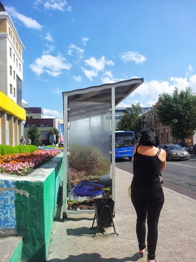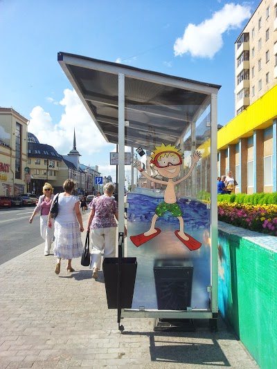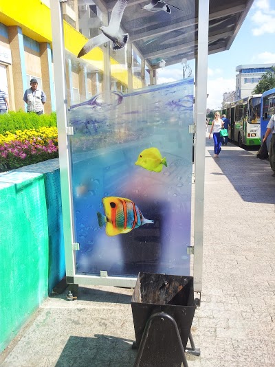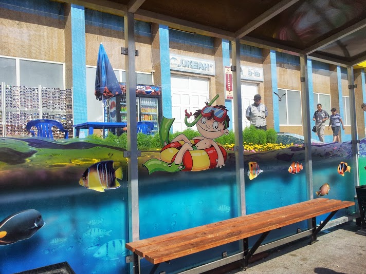 Так совсем недавно преобразился остановочный комплекс у торгового центра «Океан». Благодаря не самой дорогой, но достаточно практичной самоклеящейся пленке, остановка превратилась в аквариум и морской пляж. В аквариуме, как водится, плавают рыбки, а на пляже на морских волнах плещутся два забавных мальчугана. Вроде бы все просто, но очень позитивно!